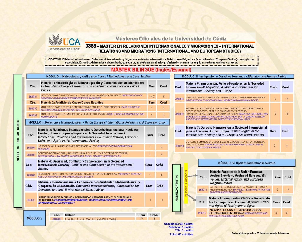 | WEB DEL MÁSTER EN RELACIONES INTERNACIONALES Y MIGRACIONES / MASTER IN INTERNATIONAL RELATIONS AND MIGRATIONS (International and European Studies): https://centreofexcellencejeanmonnet.uca.es/664-2/ – Fecha de publicación del título en el BOE Tipo de enseñanza: Máster Oficial, modalidad presencial Duración del programa formativo (créditos/años): 60 créditos ECTS / 1 año académico Curso académico de implantación: 2019/2020 Rama de conocimiento:Derecho y especialidades jurídicas Centro responsable del título: Facultad de Derecho (Universidad de Cádiz) Lenguas utilizadas: 77% inglés y 23% español Lugar de impartición: Facultad de Derecho del Campus de Jerez de la FronteraInterés académico, científico o profesional del MásterPlazas ofertadas: 20Salidas Académicas y profesionalesFicha Informativa Contacto: master.internationalrelations@uca.es |
