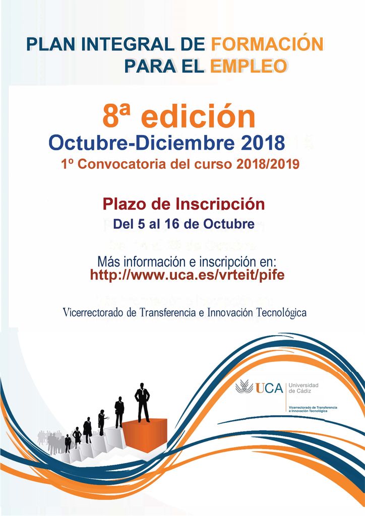 El Vicerrectorado de Transferencia e Innovación Tecnológica, pone en marcha la 8ª Edición del PLAN INTEGRAL DE FORMACIÓN PARA EL EMPLEO (PIFE) para el curso académico 2018/2019, con la finalidad de mejorar la empleabilidad de los alumnos matriculados en la Universidad de Cádiz.