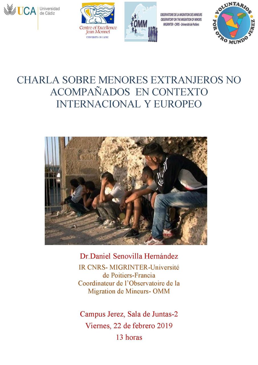 El Viernes 22 de febrero 2019, a las 13h, se celebra la Charla sobre Menores Extranjeros no Acompañados en Contexto Internacional y Europeo impartida por Dr.Daniel Senovilla Hernández,IR CNRS- MIGRINTER-Université de Poitiers-Francia Coordinateur de l’Observatoire de la Migration de Mineurs- OMM.