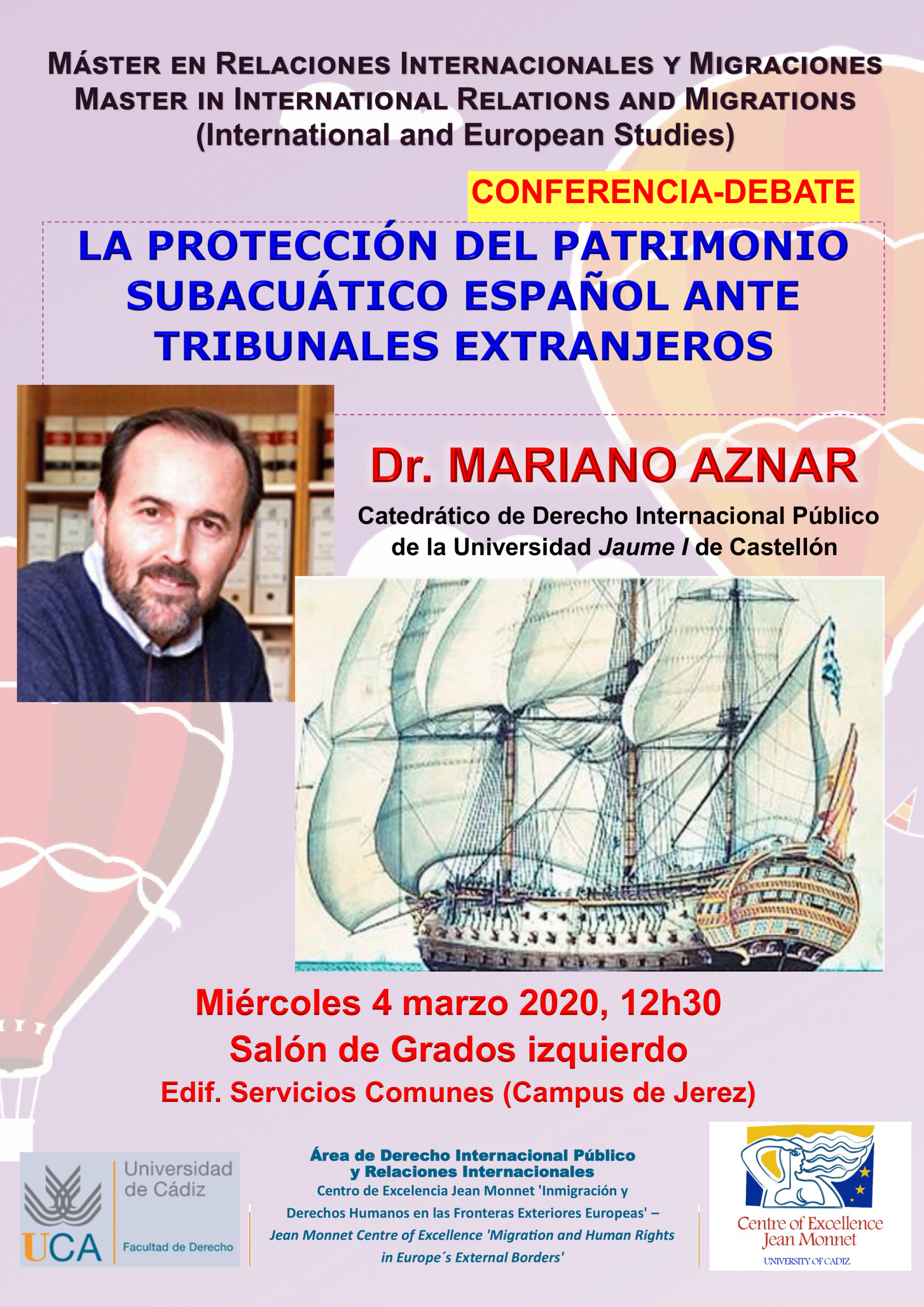 Este seminario que organiza el Área de Derecho Internacional Público y Relaciones Internacionales de la Universidad de Cádiz y en el que participará el Dr. Mariano Aznar, Catedrático de Derecho Internacional Público de la Universidad Jaume I de Castellón, forma parte de los Seminarios del Máster en Relaciones Internacionales y Migraciones / Master in International Relations and Migrations (International and European Studies), pero la asistencia está abierta a todas las personas interesadas.