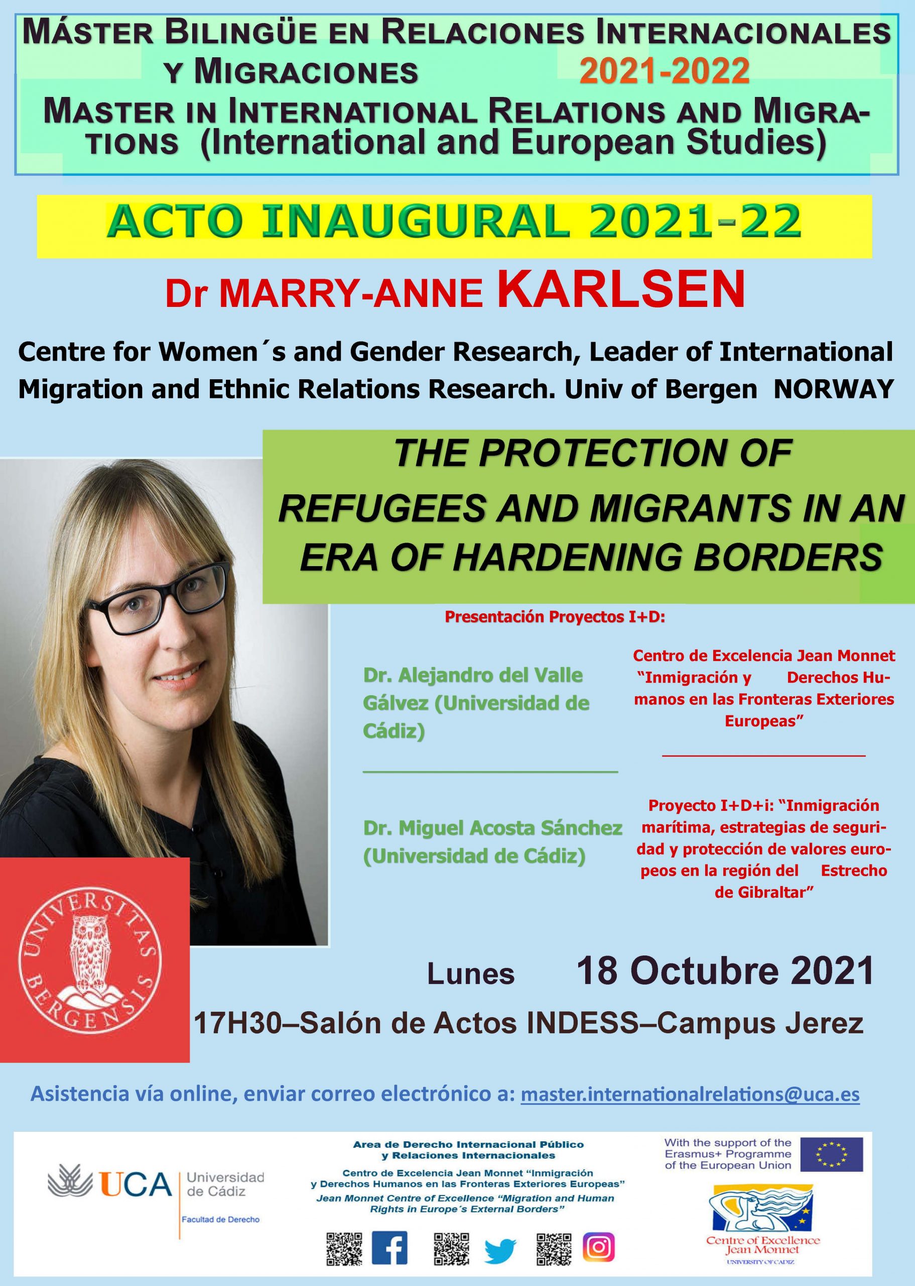 Conferencia Inaugural: “The protection of refugees and migrants in an era of hardening borders” de la Dra. Marry-Anne Karlsen, investigadora del Centro de Investigación sobre la Mujer y el Género (SKOK) de la Universidad de Bergen, Noruega, y jefa de la Unidad de Investigación sobre Migración Internacional y Relaciones Étnicas de Bergen (IMER Bergen)