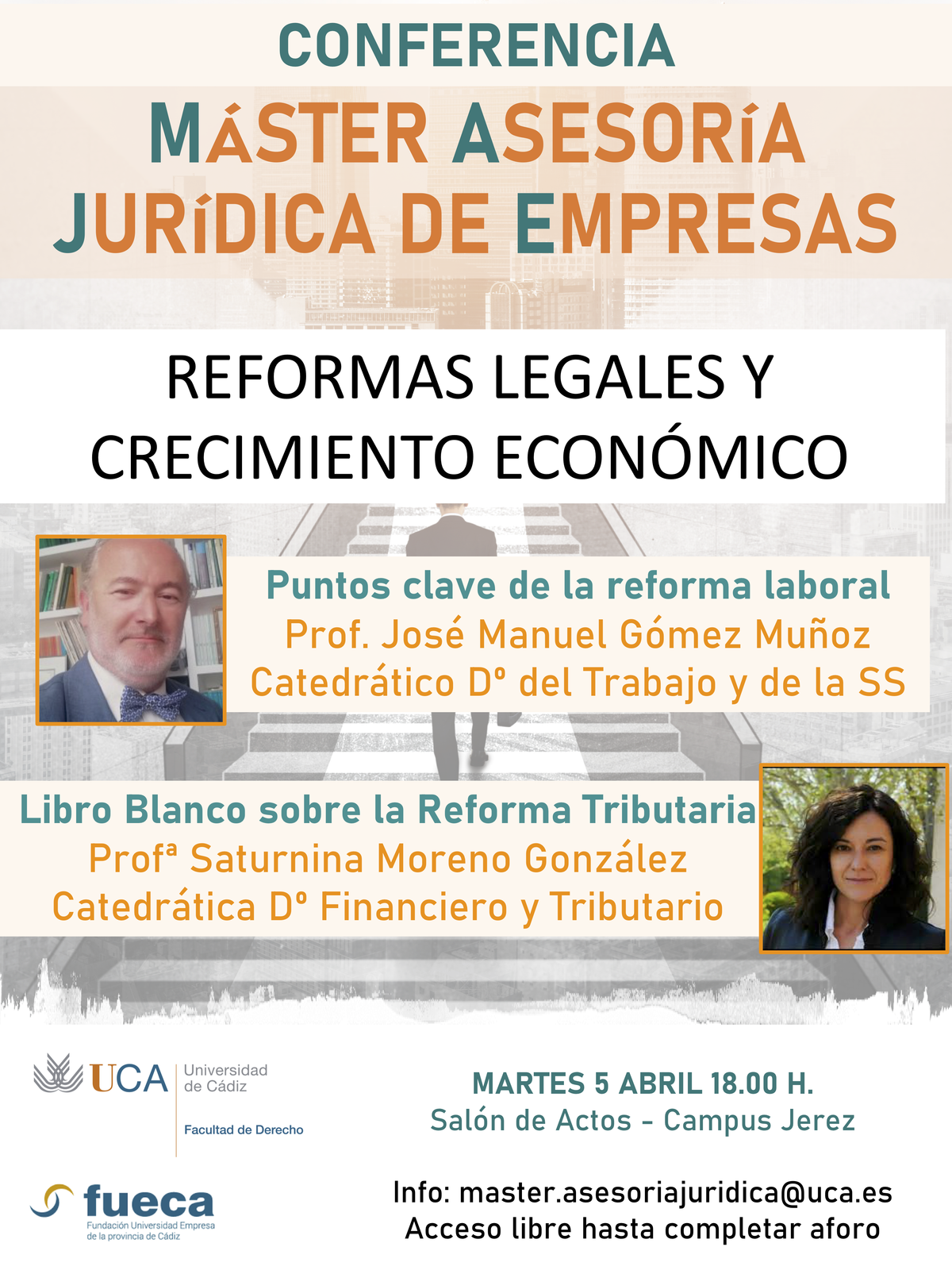 El martes 5 de abril de 2022 a las 18:00h, en el Salón de Actos del Campus de Jerez, se celebra la conferencia “Reformas Legales y Crecimiento Económico” organizada por el Máster Asesoría Jurídica de Empresas.
