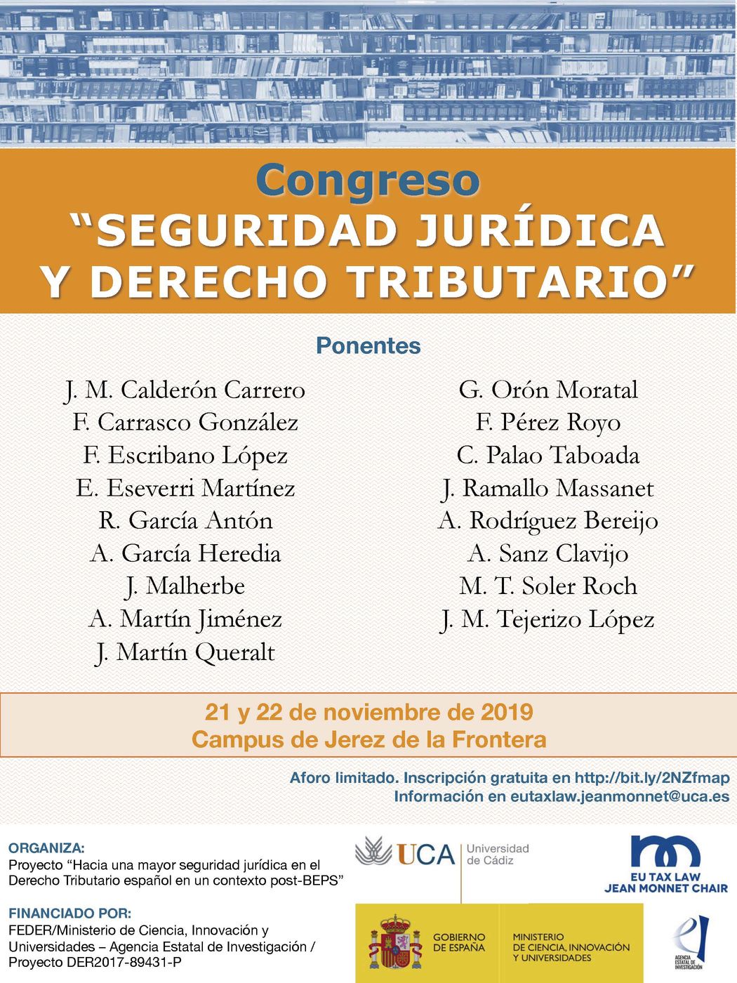 El Proyecto de investigación “Hacia una mayor seguridad jurídica en el Derecho Tributario español en un contexto post-BEPS” organiza el Congreso “Seguridad Jurídica y Derecho Tributario”, a celebrar los días 21 y 22 de noviembre en el Campus de Jerez de la Universidad de Cádiz.