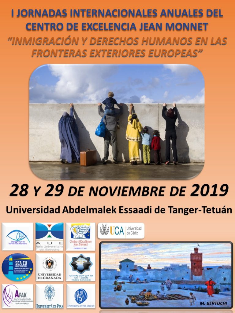 Los próximos días 28 y 29 de Noviembre de 2019, tendrán lugar las I JORNADAS INTERNACIONALES DEL CENTRO DE EXCELENCIA JEAN MONNET “INMIGRACIÓN Y DERECHOS HUMANOS EN LAS FRONTERAS EXTERIORES EUROPEAS”, en la Universidad Abdelmalek Essaadi de Tanger-Tetuán (Marruecos). Estas Jornadas Internacionales, bilingües español y francés, tienen como objetivo analizar y acercar a los estudiantes de grado, posgrado y doctorado, y a la sociedad civil de Marruecos las cuestiones relativas a las políticas migratorias de la Unión Europea, Marruecos, así como la promoción y protección de los derechos humanos de las personas migrantes.