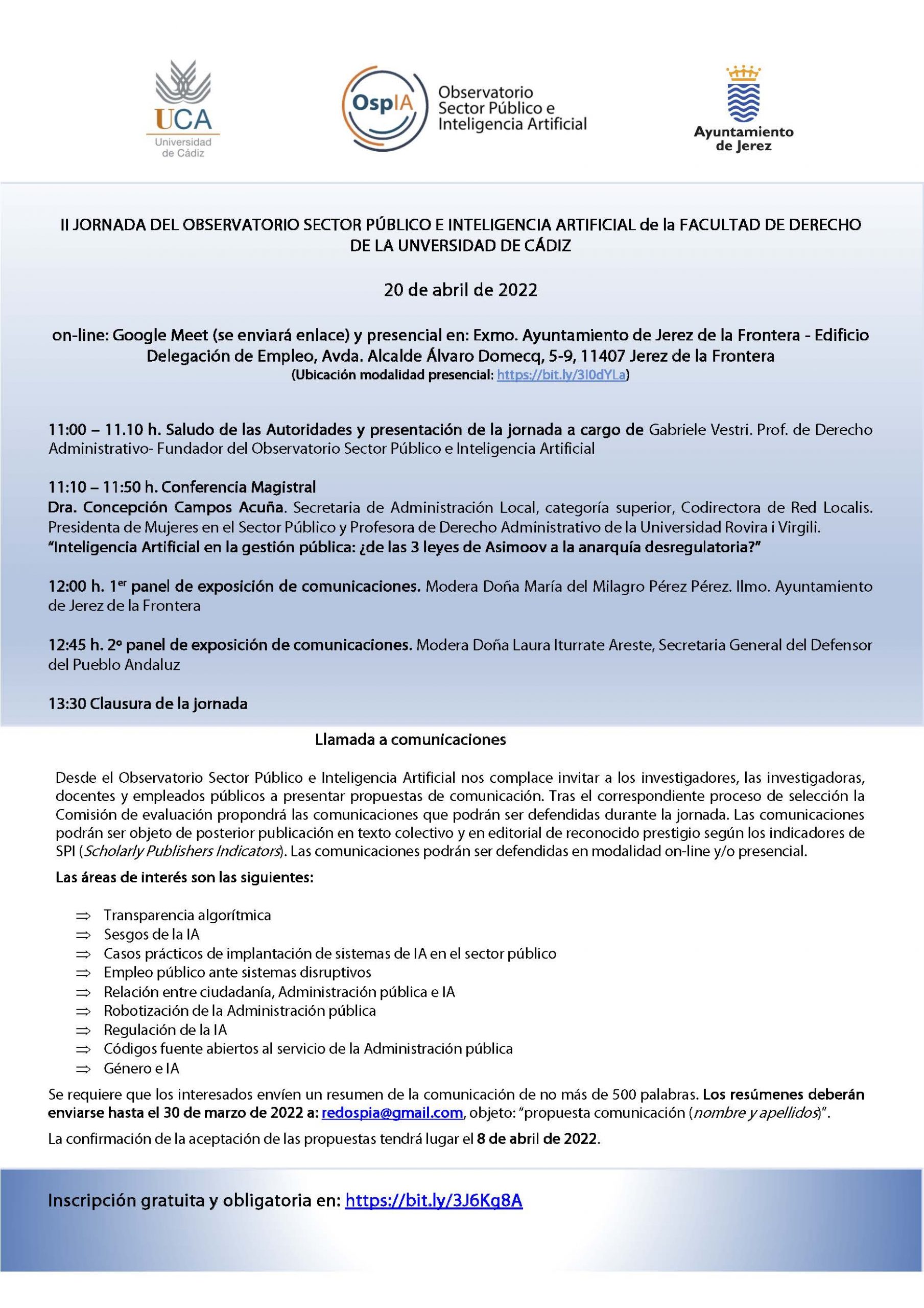 Desde la dirección del Observatorio Sector Público e Inteligencia Artificial (OspIA) de la Facultad de Derecho de la Universidad de Cádiz tenemos el placer de comunicar que el próximo día 20 de abril de 2022 tendrá lugar la 2ª Jornada del Observatorio Sector Público e Inteligencia Artificial.