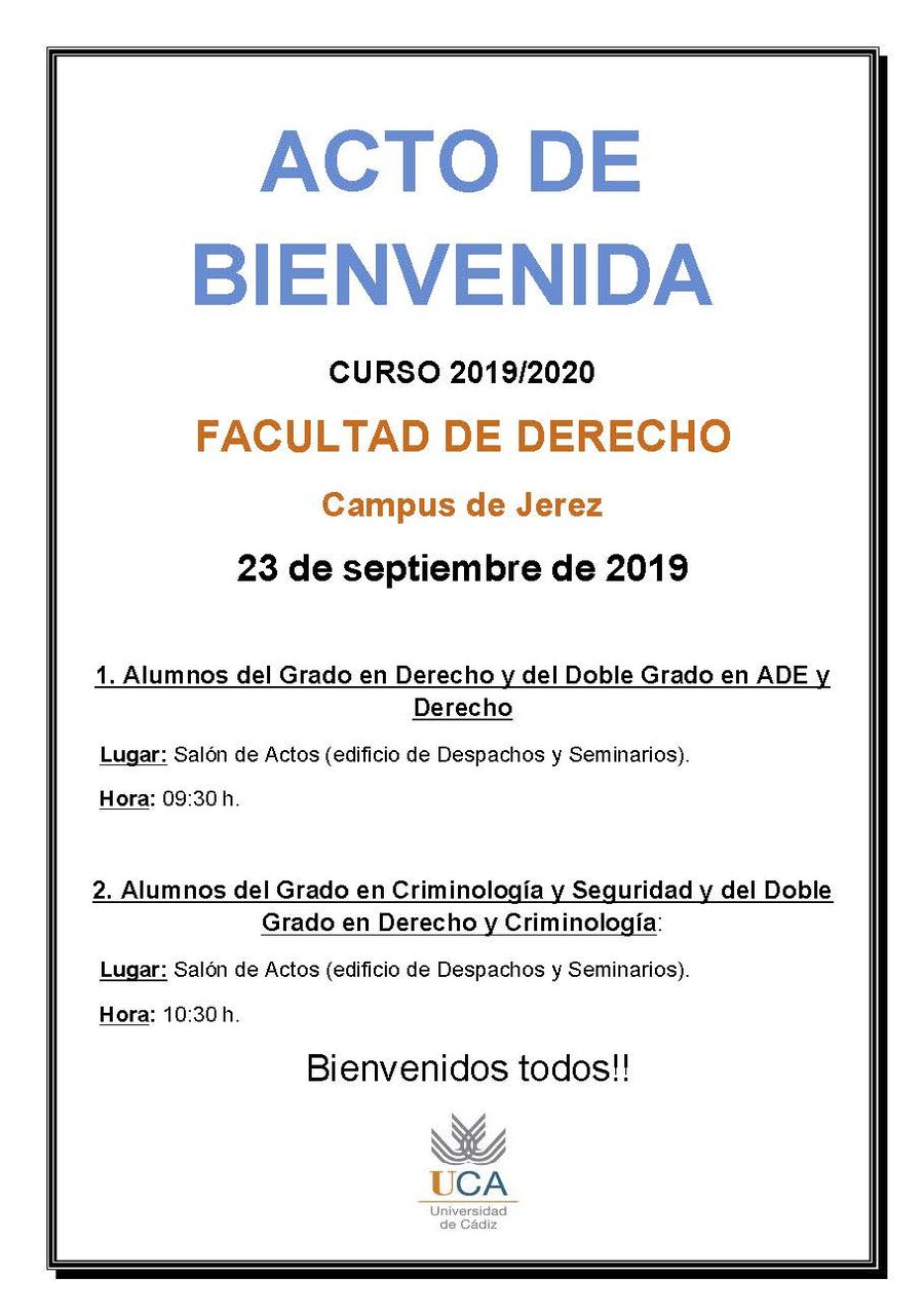 El próximo 23 de Septiembre de 2019 se realizará el Acto de Bienvenida en el Salón de Actos del Edificio de Despachos y Seminarios de la Facultad de Derecho del Campus de Jerez.