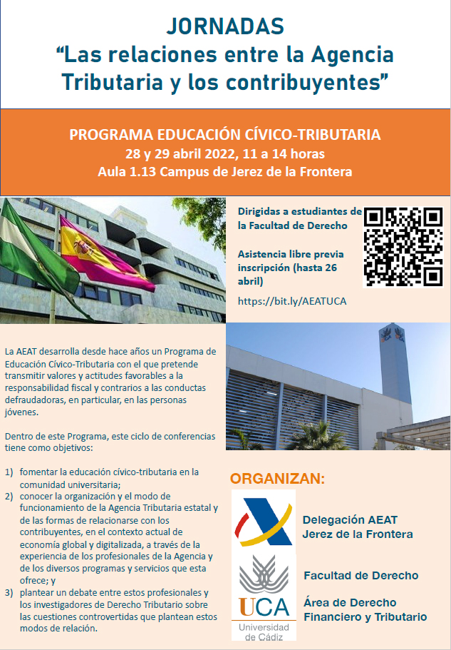 Durante los días 28 y 29 de abril de 2022, de 11h a 14h se celebran las jornadas “Las Relaciones entre la Agencia Tributaria y los Contribuyentes” en el aula 1.13 del Campus de Jerez de la Frontera.