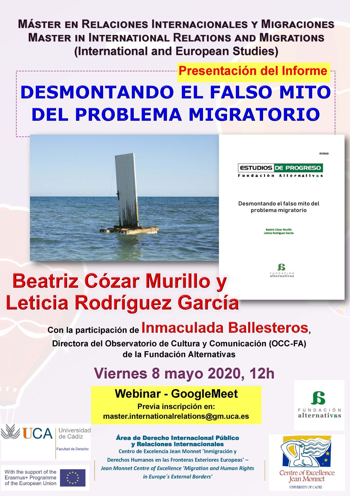 El Área de Derecho Internacional Público y Relaciones Internacionales (Facultad de Derecho – UCA) organiza y les invita a la Presentación del Informe: “DESMONTANDO EL FALSO MITO DEL PROBLEMA MIGRATORIO”, en el que intervendrán Dª Beatriz Cózar Murillo y Dª Leticia Rodríguez García, con la participación de Inmaculada Ballesteros, Directora del Observatorio de Cultura y Comunicación (OCC-FA) de la Fundación Alternativas.