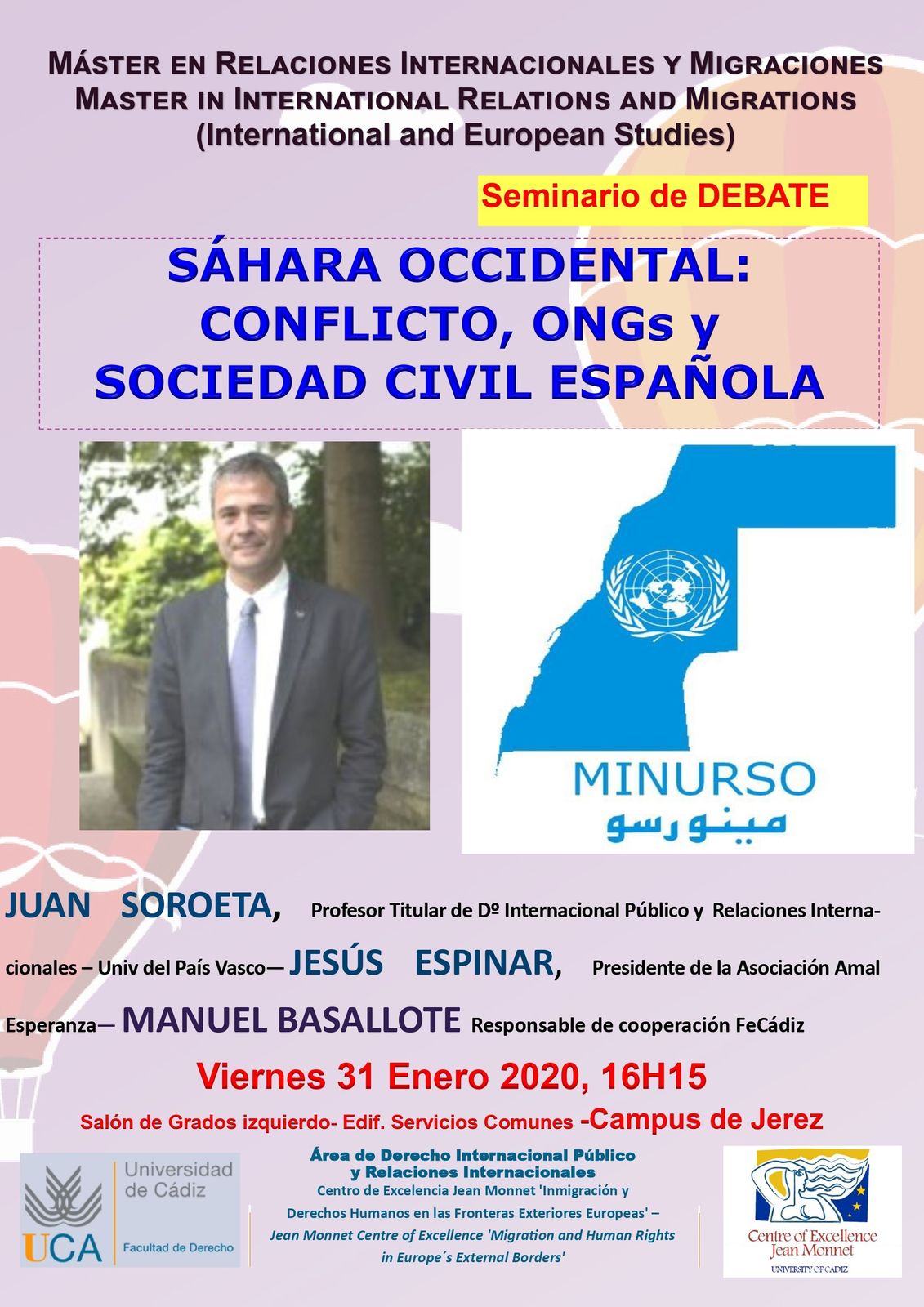 El Área de Derecho Internacional Público y Relaciones Internacionales de la Universidad de Cádiz ha organizado el Seminario de debate: «Sáhara Occidental: Conflicto, ONGs y Sociedad Civil Española», en el cual participarán Juan Soroeta, Profesor Titular de Derecho Internacional Público y Relaciones Internacionales de la Universidad del País Vasco, Jesús Espinar, Presidente de la Asociación Amal-Esperanza y Manuel Basallote, Responsable de cooperación FeCádiz.