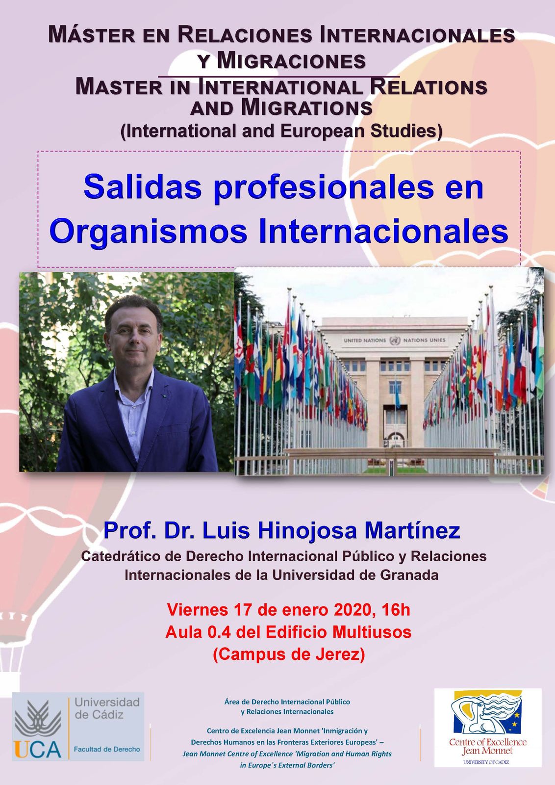 El Área de Derecho Internacional Público y Relaciones Internacionales (Facultad de Derecho) organiza el Seminario «Salidas profesionales en Organismos Internacionales», impartido por el Prof. Dr. Luis Hinojosa Martínez, Catedrático de Derecho Internacional Público y Relaciones Internacionales de la Universidad de Granada.