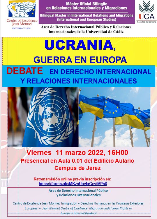 El próximo viernes 11 de marzo tiene lugar la actividad “Ucrania, Guerra en Europa – Debate de Derecho Internacional y Relaciones Internacionales”, moderado por el Dr. D. Alejandro del Valle Gálvez, Catedrático de Derecho Internaiconal Público de la Universidad de Cádiz y Director del Centro de Excelencia Jean Monnet “Derechos Humanos en las Fronteras Exteriores Europeas” – Jean Monnet Centre of Excellence “Migration and Human Rights in Europe?s External Borders”.