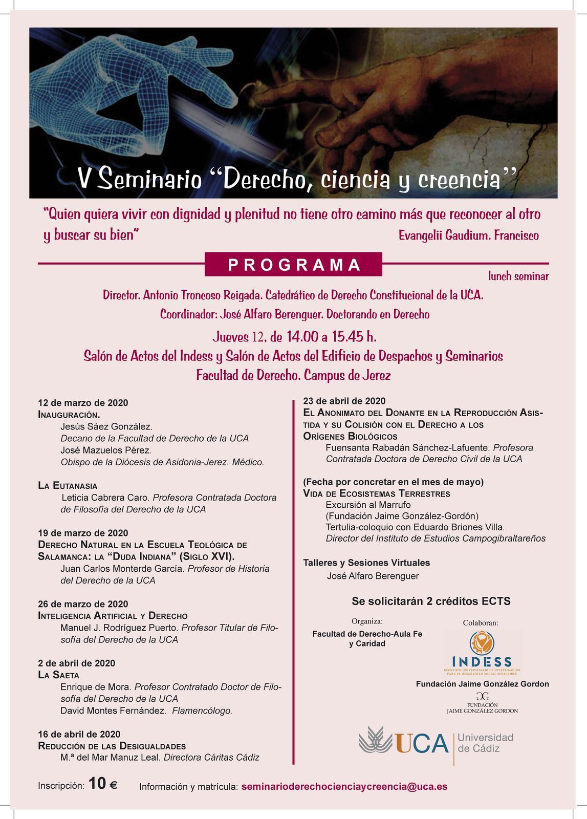 El jueves 12 de marzo de 2020, de 14:00h a 15:45h, se lleva a cabo la inauguración del V Seminario “Derecho, ciencia y creencia” en la que intervendrán Jesús Sáez González (Decano de la Facultad de Derecho de la UCA) y José Mazuelos Pérez (Obispo de la Diócesis de Asidonia-Jerez. Médico).
