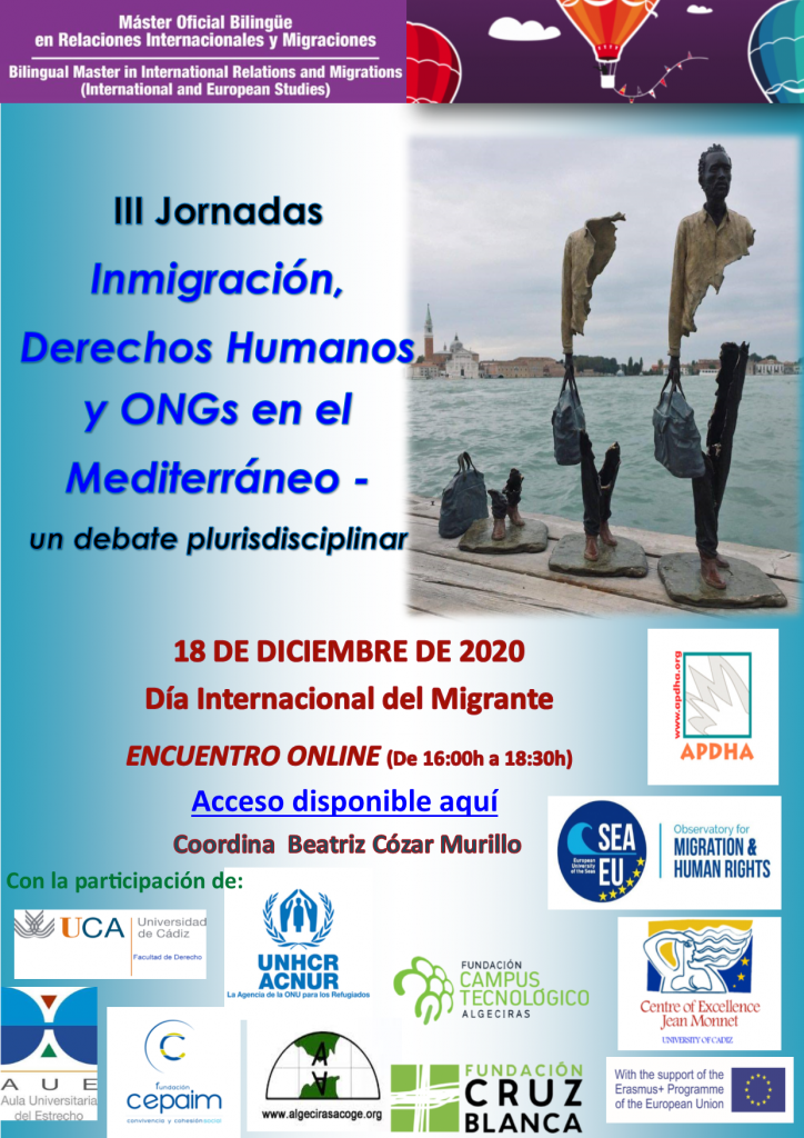 El próximo viernes 18 de diciembre de 2020, se celebrarán en modalidad online las III Jornadas Inmigración, Derechos Humanos y ONGs en el Mediterráneo – un debate pluridisciplinar, organizadas por el Centro de Excelencia Jean Monnet «Inmigración y Derechos Humanos en las Fronteras Exteriores Europeas», el Grupo de Investigación «Centro de Estudios Internacionales y Europeos del Área del Estrecho» – SEJ 572 – del Plan Andaluz de Investigación, y con la colaboración del programa Erasmus+ de la Unión Europea.