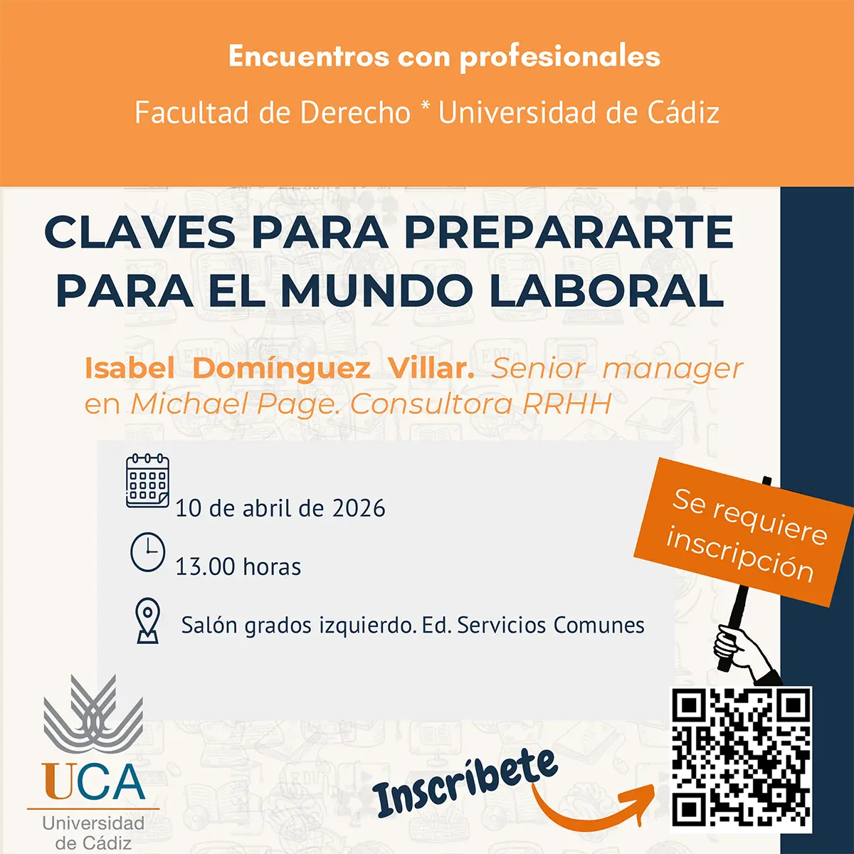 Se trata de una sesión titulada “Claves para prepararte para el mundo laboral”, impartida por Isabel Domínguez Villar (Senior Manager en Michael Page, Consultora de RRHH), en la que se abordarán aspectos prácticos sobre empleabilidad, orientación profesional y acceso al mercado de trabajo.