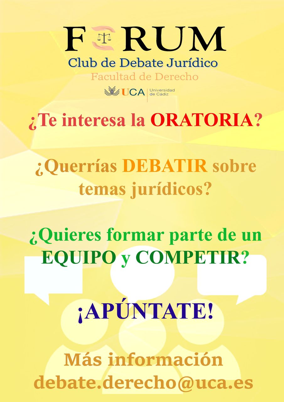 FORUM es el Club de Debate Jurídico de la Universidad de Cádiz y se encarga de la realización de debates competitivos por parte de los alumnos de la Facultad de Derecho.