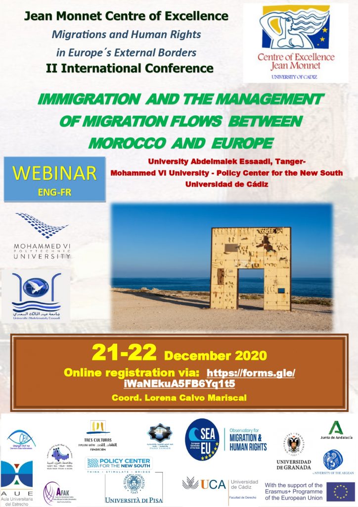 Los próximos días lunes 21 y martes 22 de diciembre 2020, tendrán lugar las II Jornadas Internacionales del CENTRO DE EXCELENCIA JEAN MONNET “INMIGRACIÓN Y DERECHOS HUMANOS EN LAS FRONTERAS EXTERIORES EUROPEAS”, bajo el títuloIMMIGRATION AND THE MANAGEMENT OF MIGRATION FLOWS BETWEEN MOROCCO AND EUROPE