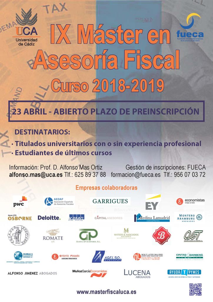 Destacar asimismo que el claustro del curso está compuesto por profesionales del asesoramiento y la consultoría tributaria, personal de la Administración Tributaria y profesores de la UCA.
